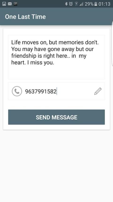 Иногда жизнь не дает возможности сказать надлежащее Good Bye. Вы можете использовать это приложение, чтобы отправить любимому человеку, в одно сообщение, выражая свои чувства максимальные для них. В отличие от других приложений, мы имеем следующие уникальные особенности.