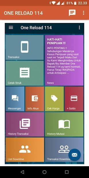 Android One Reload 114 application is a free mobile application as our facilities and services for all loyal partners One Reload 114. With this application all members can trade top-up all operators, inject internet quota, buy PLN tokens, pay PPOB bills, etc. .