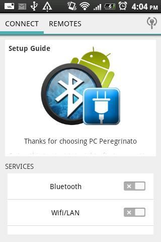 PC Peregrinato является пульт дистанционного управления решением для управления ПК удаленно с помощью Bluetooth и Wi-Fi соединение. Для использования соединения, предоставленную ПК Peregrinato необходимо установить плагины приложений.