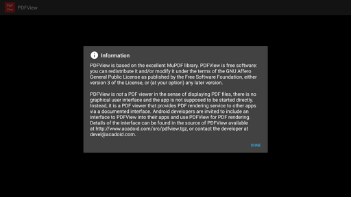 просмотр PDF в смысле отображения файлов PDF, не существует графического пользовательского интерфейса, а приложение не должно быть запущено напрямую. Вместо этого он представляет собой VDF-просмотрщик, который предоставляет услуги PDF-рендеринга к другим приложениям через документированный интерфейс. Разработчики Android предлагаются включить интерфейс для PDFView в их приложения и использовать PDFVIEW для рендеринга PDF. Детали интерфейса можно найти в источнике PDFView.