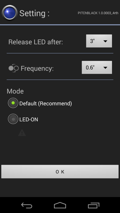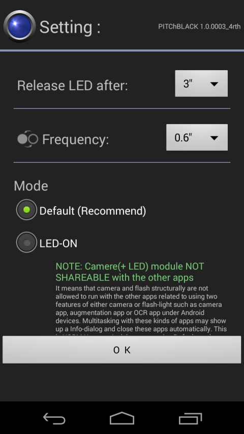 PitchBlack turns a smartphone to light, such as torch or flashlight. Strobe button is one touch one-click for frequent. Blink button can control the frequency of blink with realtime. Some devices may not operate well so that your feedback help me to improve this app. Thank you. ****************************************************************************************** ★android.permission.READ_PHONE_STATE permission: Required for automatic turning-LED-off when a smartphone is ringing or OFF-HOOK, ****************************************************************************************** https://twitter.com/qrvit. http://lightandtorch.blogspot.com. https://www.facebook.com/lightandtorch. -----------------------------------. @Tested on belows: Samsung Galaxy Note4, Samsung Galaxy 6, Samsung Galaxy Edge, LGE Optimus Vu2, LG Optimus 3D Cube, LG AKA, Sony Xperia Z3, Samsung Galaxy Note 1. ******************************************************************************************