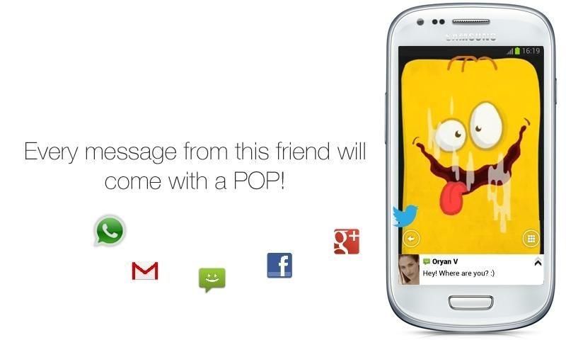 Персонализируйте свои уведомления на с помощью забавных видео и анимации! Pops – это новый и увлекательный способ получения уведомлений. С приложением Pops вы сможете БЕСПЛАТНО получать потрясающие видео и анимацию с каждым приходом SMS, почты, а также уведомлений с Facebook, twitter, WhatsApp, Google +, Viber и других сервисов. Оценки прессы: "Приложение недели для Android" www.Gizmodo.com Основные функции ✔ Экранные уведомления о новых сообщениях из различных источников, включая сами текстовые сообщения (SMS), а также имя и фото отправителя. ✔ Визуально улучшенная работа с сообщениями. ✔ Постоянно растущая галерея видео и всплывающей анимации – более 100 коллекций на выбор. ✔ Использование собственных фотографий или видео, а также камеры устройства для персонализации Pops. ✔ Журнал всех уведомлений, разбитый по категориям, с легким доступом к каждому из источников для быстрого ответа. ✔ Легкое удерживание всплывающих окон на экране на определенный период (например, на время совещания). Примечание: настройки позволяют отключать Pops в конкретные промежутки времени (например, с 22:00 до 7:00) или когда вы находитесь на совещании. Приложение Pops активно, только когда экран вашего Android-устройства выключен.
