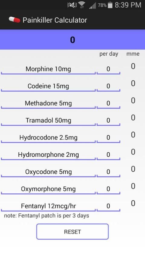 Painkiller калькулятор отображает дозировку общих опиоидов, как они эквивалентны морфин, известного как их Морфин миллиграмм эквивалент (MME). Если вы хотели сохранить пациенту под 100 множеством MME в день, Painkiller Калькулятор может показать: