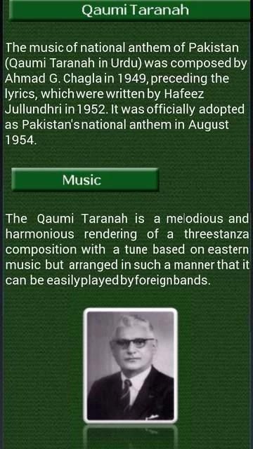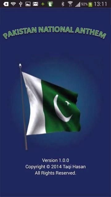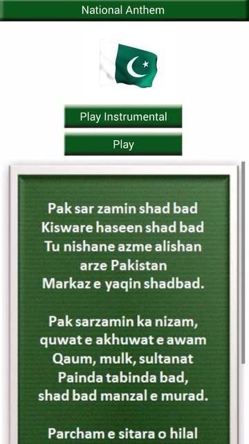 Приложение позволяет играть в Пакистан Государственный гимн как в инструментальной и вокальной форме. Он отображает английский, урду и Роман урду текст так, чтобы пакистанцы специально за рубежом, могут сделать своих детей понимать смысл каждого слова нашего государственного гимна. Приложение также предоставляет историю развития Пакистана национального гимна.