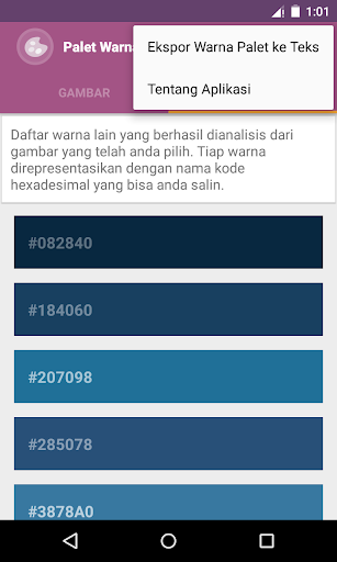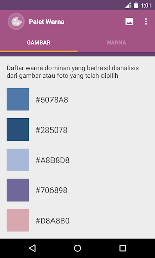 Aplikasi Palet Warna adalah aplikasi sederhana untuk mengambil warna dan kode warnanya (kode hexadesimal) dari gambar atau foto yang tersimpan di album atau galeri gambar perangkat anda.