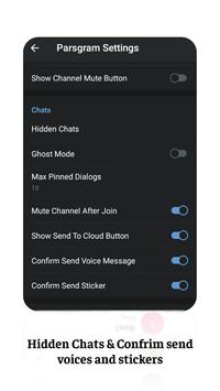 • Ghost mode: the ability to read messages with status «offline», without reading confirmation (second tick) and typing.