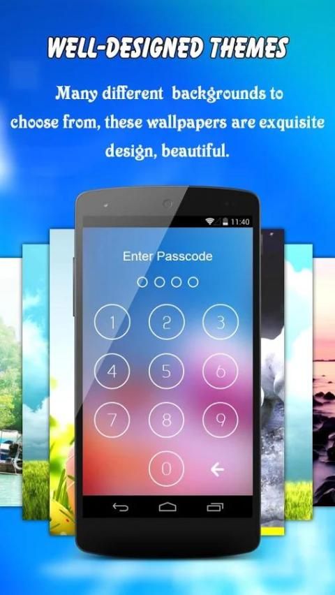 Очень элегантный способ, чтобы разблокировать экран, который обеспечивает информацию даты и времени. Вы можете включить и отключить блокировку экрана Passcode от настроек. Несколько различных обоев также предусмотрены приложением. Вы можете установить любой обои на блокировки фона экрана в соответствии с вашим желанием и настроением. Блокировка паролем экрана обеспечивает лучшие качества изображения. Блокировка паролем Экран совместим почти со всеми Android.