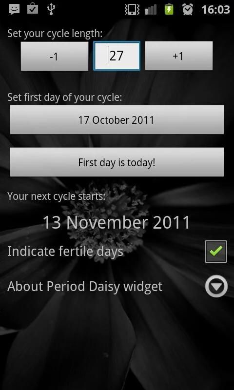 Этот простой виджет позволяет отслеживать ваши плодородные и овуляции циклов легко. Хорошо выглядит цветок на телефоне дает всегда информацию, когда ваш период начинается и когда ваши плодородные дни.