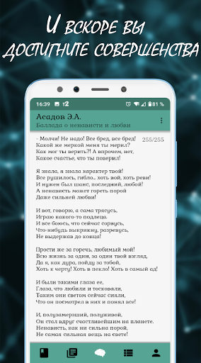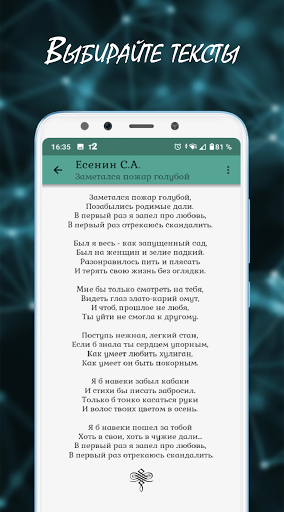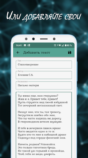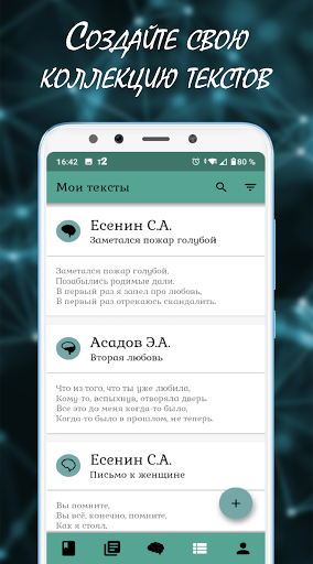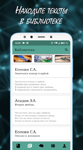 Чтобы упростить поиск и добавление текстов, в приложение добавлена библиотека. В ней вы найдёте лучшие стихи, песни, басни и поэмы великих авторов.