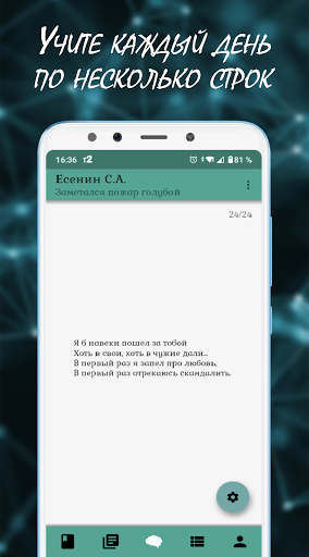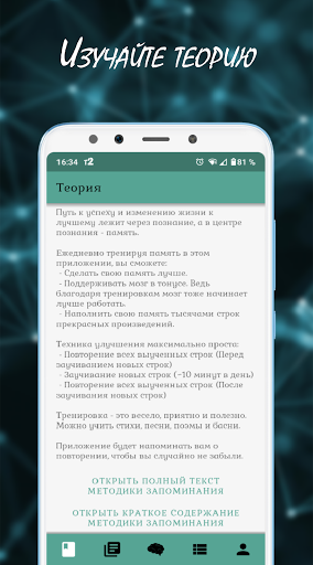 Это приложение учит, что разбив большую задачу на маленькие подзадачи, и двигаясь к цели маленькими, но уверенными шагами, можно свернуть горы. Спустя какое-то время в вашей голове будут сотни и тысячи строк ваших любимых произведений. Вы сможете придавать памяти всё с помощью воли и так же легко доставать из неё всё, что вы туда положили. Уделяя данной методике совсем немного времени каждый день, вы сможете добиться не только невероятных результатов, но и получить огромное удовольствие от занятий.