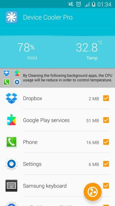 Устройство Cooler Pro это совершенно бесплатный полнофункциональный Android приложение, которое сканирует устройство и показать температуру центрального процессора на экране, он обнаруживает приложения, которые используют большие ресурсы CPU и сделать телефон или планшет лага в убить их и освободить память вашего устройства .