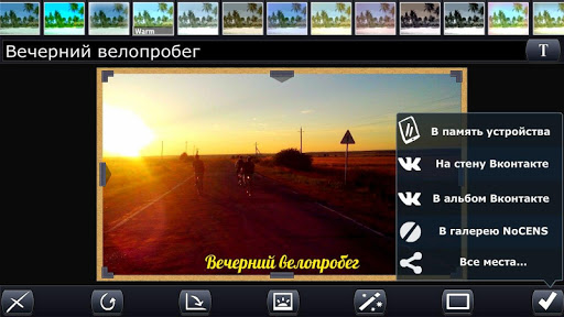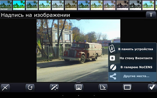 - Возможность сохранения готовых изображений как в память устройства, так и в любой сервис, установленный на смартфоне. Быстрая публикация в соцсети, а также галерею изображений NoCENS.