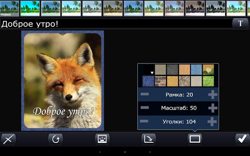 - Панель рамок, позволяющая наложить однотонную, градиентную или текстурную рамку вокруг изображения, а также закруглить его уголки.