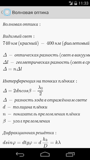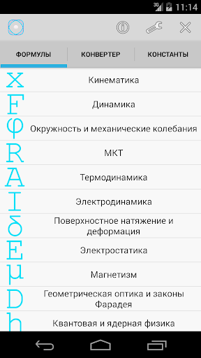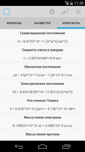 Physics Lab представляет собой сборник большинства физических формул, входящих в школьную программу, конвертер физических величин и базу данных основных физических постоянных.