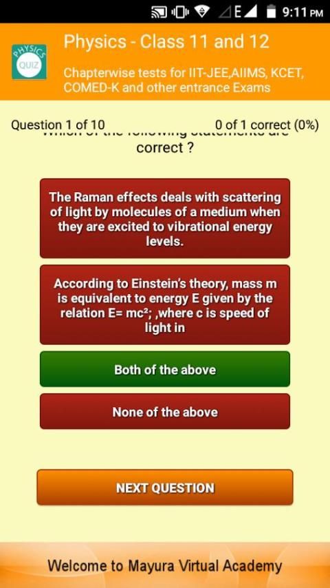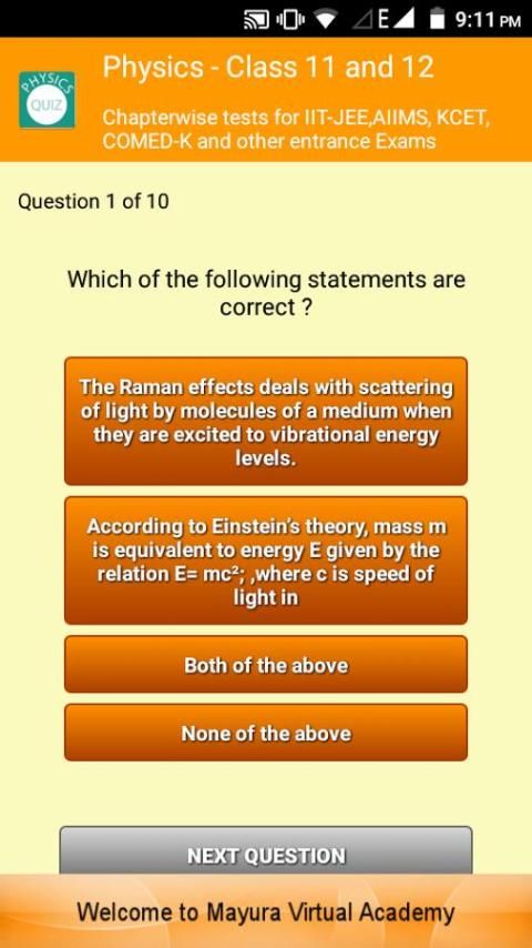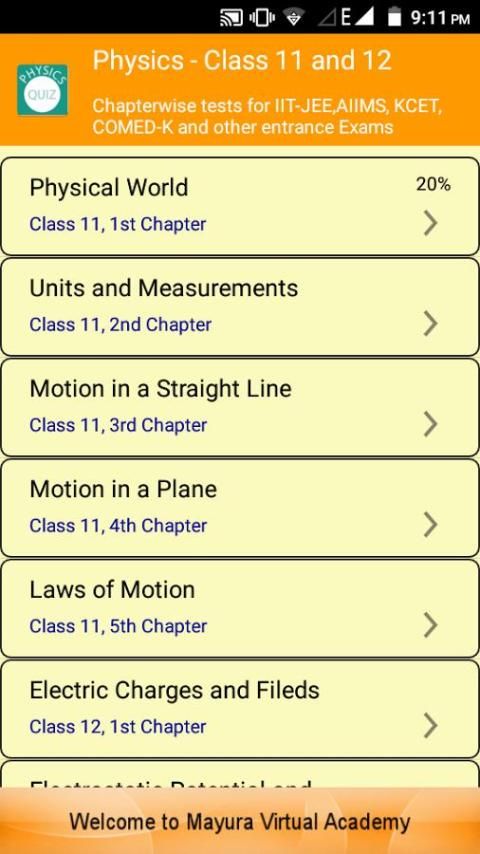 Это приложение является образовательный ресурс предназначен, чтобы попытаться помочь студентам, обучающимся за их различных UG инженерных и медицинских вступительных экзаменов, таких как IITJEE, AIIMS, KCET, COMED-K, чтобы назвать несколько. Приложение охватывает chapterwise тесты для класса 11 и 12 предмета физики. Каждый тест будет иметь 10 вопросов, отвечая на вопрос в тесте, студент будет дан с ответом на этот конкретный вопрос, в конце студентов тестов могут проверить свой тестовый балл.