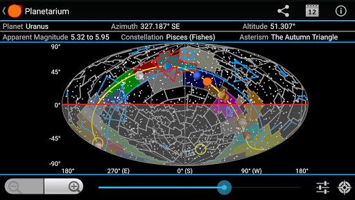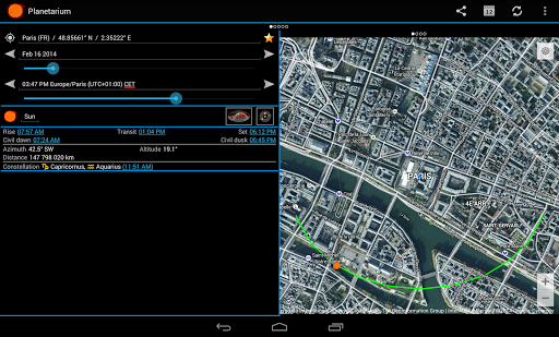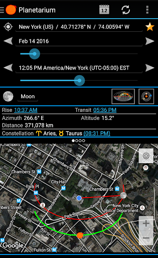 Select the position of the observer, date, time and time zone and display the various information and views available.