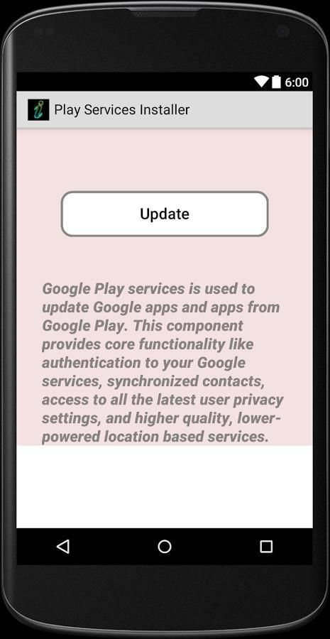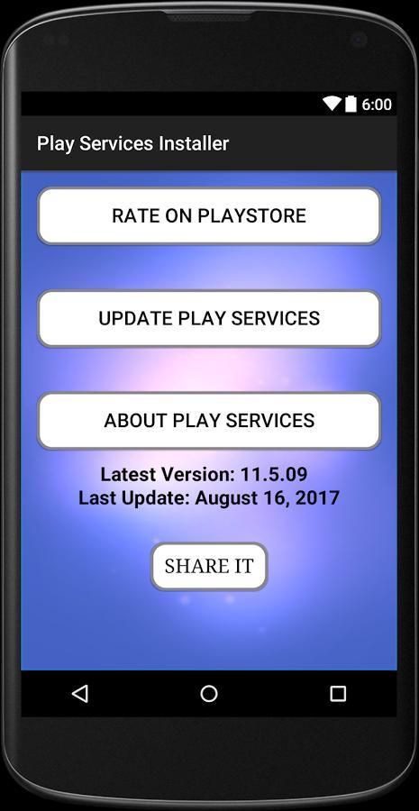 Play Services Installer крошечного инструмент для быстрого местонахождения Google Play сервисов для проверки состояния, обновления и исправления ошибок, связанных с ним вместе с Info Device утилитой. Он идеально подходит для обновления услуг в Google Play.