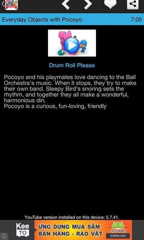 Pocoyo is a curious toddler dressed all in blue, from his blue cap to his blue jumpsuit. He's full of fun and perhaps a touch of good-natured mischief. His friends include Pato, the yellow duck; Elly, the pink elephant with a blue backpack; Loula, his faithful dog; Sleepy Bird, the droopy-eyed blue-green bird always asleep in her nest; and many others. The Narrator greets little Pocoyo every day and gently suggests an answer to anything that puzzles him. But just as often, the Narrator himself learns something valuable. Pocoyo's computer-animated world is full of simple shapes, bright colors and cheerful music. UPDATE WEEKLY!!!!!!!!!!!!!!!! Like this application? Want more movie for your kids? - Share this application - Rate & Give us your comment The content provided in this app is hosted by YouTube and is available in public domain. We do not upload any videos to YouTube or not showing any modify content. *** Please Note: Please report to YouTube or email us if any movie we linked is unauthorized or violating copyrights. This app is just customizing the videos in a more user-friendly way for users And yes, we need install Youtube to play video in this app.