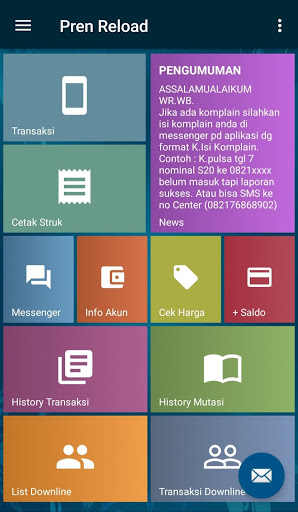 Aplikasi android Pren Reload adalah aplikasi mobile gratis untuk member-member setia Pren Reload di mana pun berada. Aplikasi ini memudahkan Anda dalam melakukan berbagai transaksi seperti pengisian pulsa, pembelian token listrik, pembayaran tagihan pasca bayar, pembelian voucher game, dll.