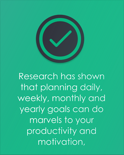 Исследование показало, что планирование цели повышает производительность. Приложение Progo позволяет вам планировать годовые, ежемесячные, еженедельные и ежедневные цели. Все при сохранении простого интерфейса, в отличие от сложных приложений, поэтому вы проводите всего несколько минут в день только на планировании.