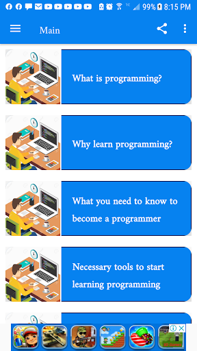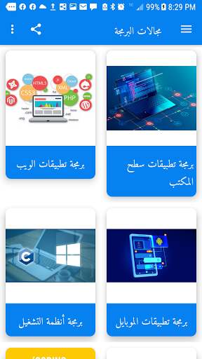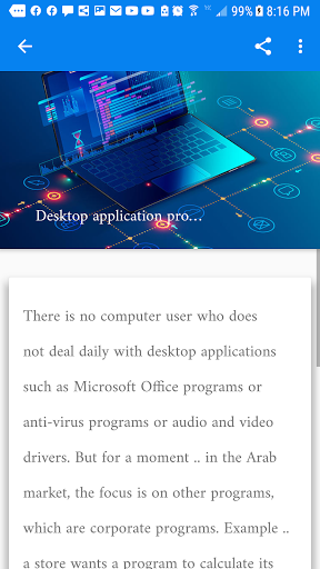 في التخصص الذي ستندرج له اثناء مسيرتك البرمجية , فيحتوي التطبيق على اجوبة لأسئلة كل لابد أن تكون في عقل كل من سمع عن البرمجه , وايضا جميع التخصصات المندرجة في علم البرمجة وماهي احتياجات كل تخصص فيها . The application of your programming guide, will help you to know everything related to programming science, as you will be aware of the specialty that you will fall into during your programming career, so the application contains answers to questions that must be in the mind of everyone who heard about programming, as well as all the disciplines included in the science of programming and what they are The needs of each specialty in it.