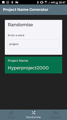 Secondly, the randomiser that allows you to enter a word and it will randomise your word to generate the project name.