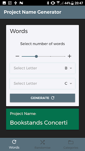 The app offers three ways of generating project names.