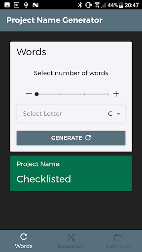 Lastly you can select a category or categories for your words to be selected from to generate your new project name.