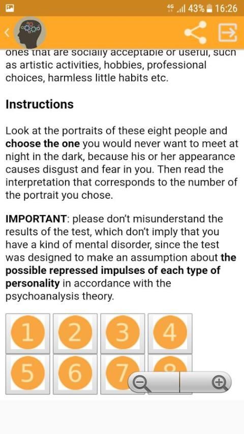 Это приложение представляет собой сборник психологических тестов, которые будут эффективно описывают вашу индивидуальность и дуют ваш ум. Первый из них представляет собой геометрический тест, где нужно случайным образом выбирать одну из геометрических фигур на экране. На основании вашего выбора появится описание определенной части вашей личности. Второй тест Сонди, целью которого является выявление наиболее глубокими подавленных импульсов вашей души. Эти и больше тестов, как это вы найдете в нашем приложении. Надеюсь, вы будете наслаждаться им и весело провести время !!!