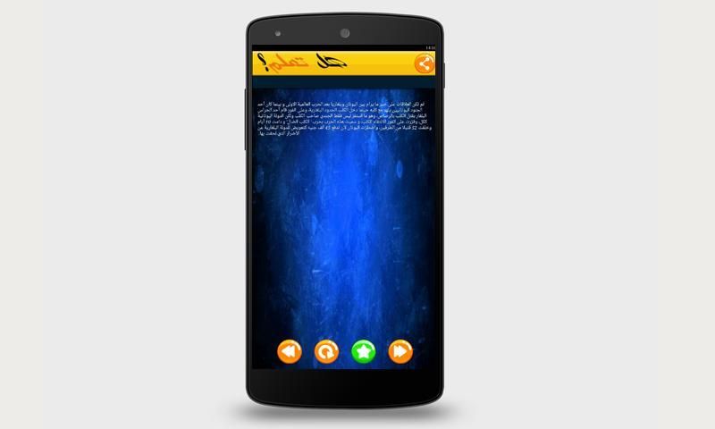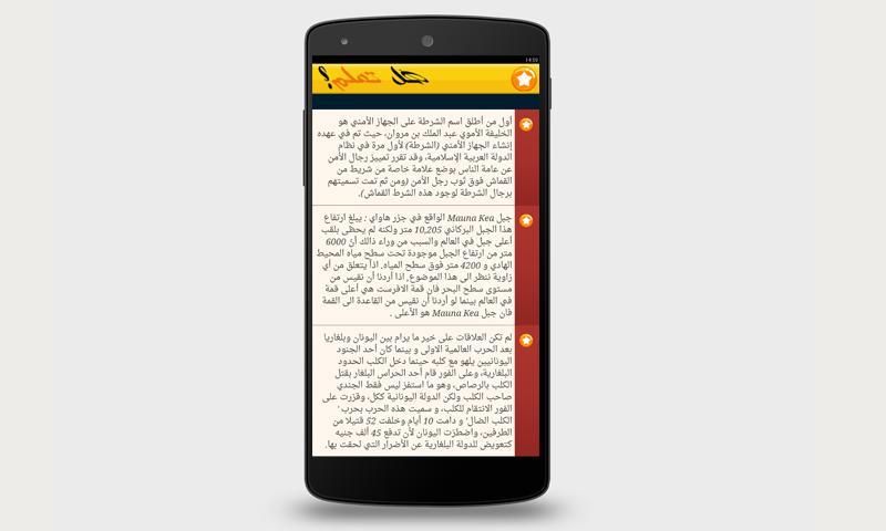 Did you know ? Educate yourself General Information Arabic is a comprehensive application for all types of cultural articles useful, every day application Educate yourself provides you with a diverse and rich texts with information that can be helpful to you in your own life. Find him a variety of information replenished daily on the Internet in various fields