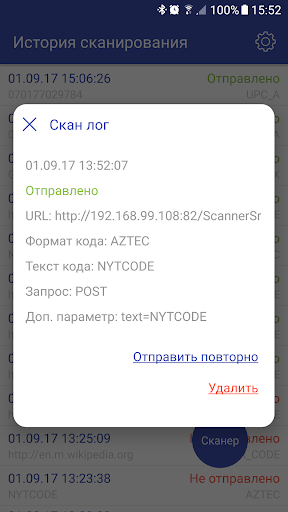 ● Отправка информации из QR или Barcode кода на ваш сервер в виде POST или GET запроса по HTTP
