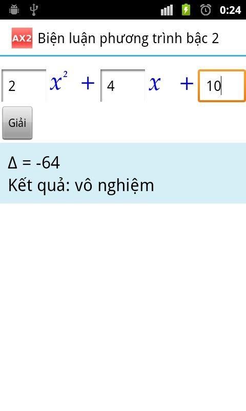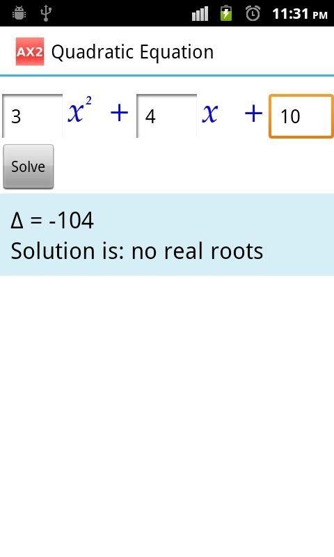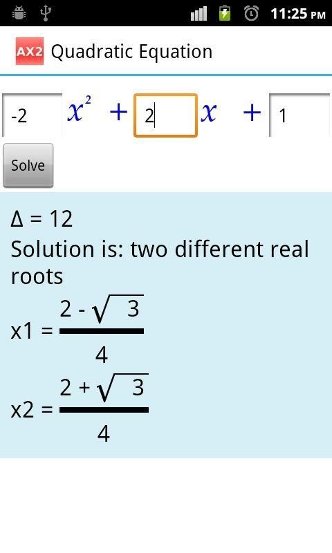 AX2 help you solve the quadratic equation. The roots of equation can show as fractions. AX2 is very useful for pupils and students to learn and test the quadratic equation.