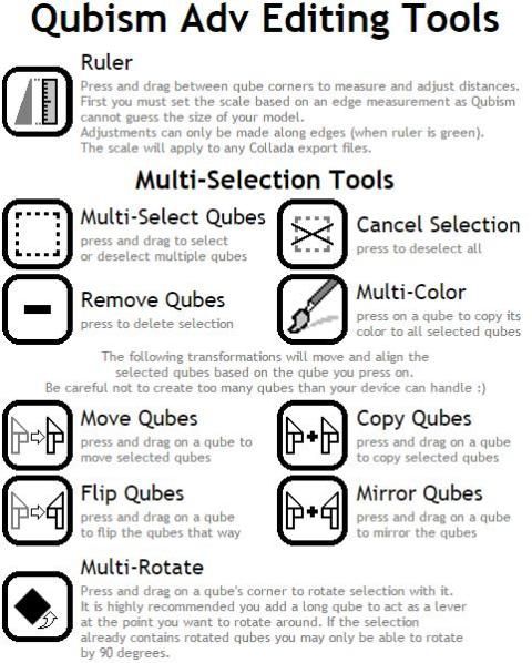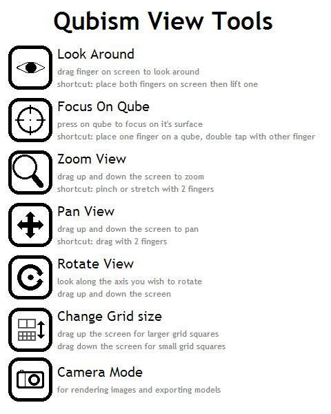 Qubism позволяет проектировать и создавать простые 3D-модели с помощью устройства с сенсорным экраном. Он делает это с помощью цифровых строительных блоков, называемых 'Qubes', которые могут быть добавлены, удалены, перемещены, растянуто, скошенная, в форме, повернуты и цветные с парой касаний.