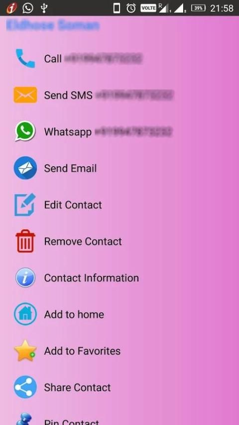 • Контакты: Поиск / звонок / сообщение / WhatsApp / электронная почта / доля / контакт / создать ярлык / сделать любимой / управлять
