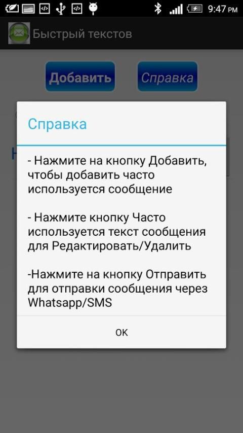 Быстрый текстов для приложения приложение поможет вам отправить быстрый/Custom/часто используемых сообщений через Whatsapp или SMS-сообщения или какие-либо другие приложения, текст в качестве входных данных только с одной или двумя щелчками мыши. Вы можете создать любое количество пользовательских/часто используемых сообщений.