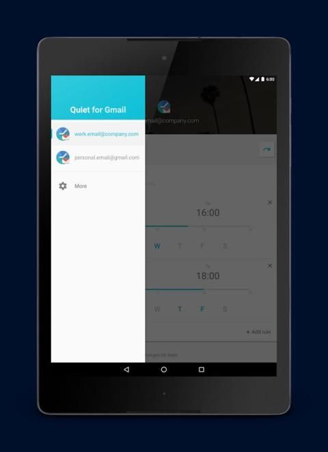 С "Quiet для Gmail" вы можете установить правила, основанные на времени, чтобы остановить уведомления от ваших учетных записей электронной почты личные / работы.