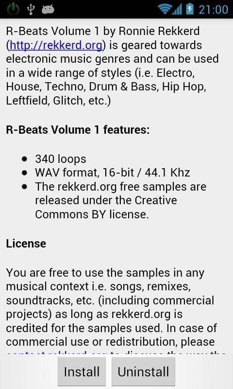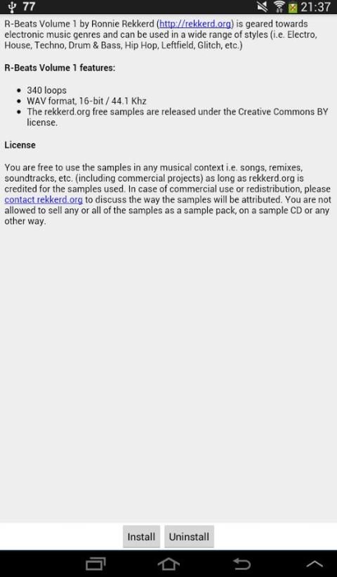Вы можете свободно использовать образцы в любом музыкальном контексте т.е. песен, ремиксов, саундтреков и т.д. (в том числе коммерческих проектов), пока rekkerd.org приписывают для образцов использовали. В случае коммерческого использования или перераспределения, пожалуйста, свяжитесь rekkerd.org для обсуждения путей образцов будет числиться. Вы не можете продать любые или все образцы в качестве образца пакета, на компакт-диске образца или любым другим способом.
