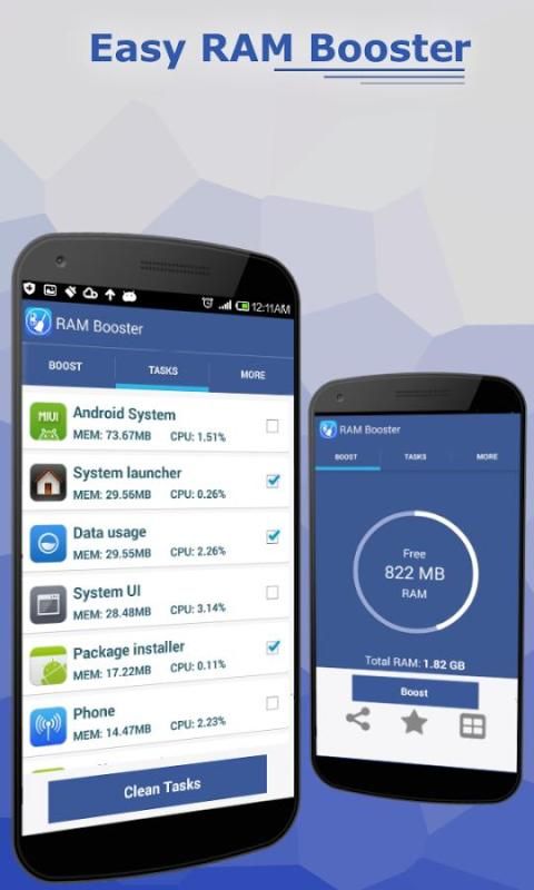 Clean up memory (RAM) and optimize phone speed by removing redundant background tasks. Stop auto-start Apps to increase boot speed and reduce memory usage. 1-tap memory cleaner and booster widget makes it easy to clean your phone directly from the home screen. Handy status of CPU, memory (RAM), GPU, camera, storage, ROM, battery and hardware features. Keep track of memory (RAM), storage space and CPU/battery temperature. Stop Apps from wasting battery life and causing device to overheat. RAM Booster is a utility app that speeds up your android phones performance just by the click of a button.It aims to take away the complexity of other task manager apps and provide the user with an easy to use and convenient interface. By killing all unwanted background processes that use up memory and also clears cache for all apps not in use RAM Booster frees up precious memory(RAM) for use.if you have tones of apps open and your device is lagging ,this app will greatly improve your speed and performance. RAM booster also has a nifty feature for letting you know when your phone is running out of memory so you can free up memory before things get worse. If you have any suggestions on improvements please leave them on the ratings and reviews section. The best part is that you can enjoy Ram Booster for FREE!! ★ Memory Boost Master Free up memory (RAM), close apps that slow down your device, and even disable auto-start apps in non-rooted devices (for Android 4.1 and later). ★ Smart Optimizer Analyze and clean junk files that take up your storage space, without worrying about erasing useful files by accident. ★ Powerful App Manager ★ CPU COOLER The most beautiful part of this app is a small, configurable widget that places on top of any app and one-click to RAM boost. Most of Android devices bundle with limited memory. Android task manager will selectively kill low priority tasks in order to reserve memory to higher priority task. That’s not always run at an appropriate time, causing low responsive apps, lagging, especially when you launch a new app after heavily browsing web pages. It causes a worse experience. Cool off your device by finding and stopping the apps that are causing it to overheat and make your battery last longer! Manage and analyze battery, data and storage usage. Identify and uninstall resource-intensive but rarely used apps. The android devices are like computers, over time, accumulate files in the cache and this makes your device work much more slowly. With "Accelerator RAM 2015" at the push of a button you get free the cache, which will make your phone run faster instantly. A cache is a special memory that Android devices have functions similar to traditional memory disks way, but is smaller and access to them is faster. Used by the microprocessor to reduce access time to data located in main memory that are used most often. But the accumulation of these data at the end makes the device work much slower.