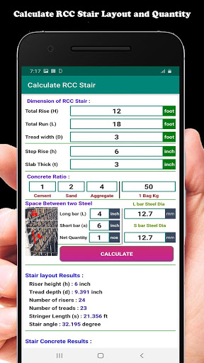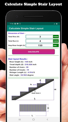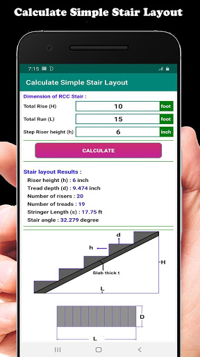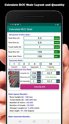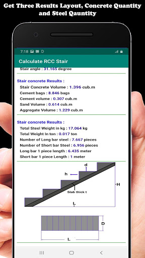 All you have to do is to put your desired measurements in app and press calculate button, and get Three types result ( 1- Stair Layout, 2- Stair Concrete Quantity, 3- Stair Steel Quantity ) and ready to be used for building your stairs plan.