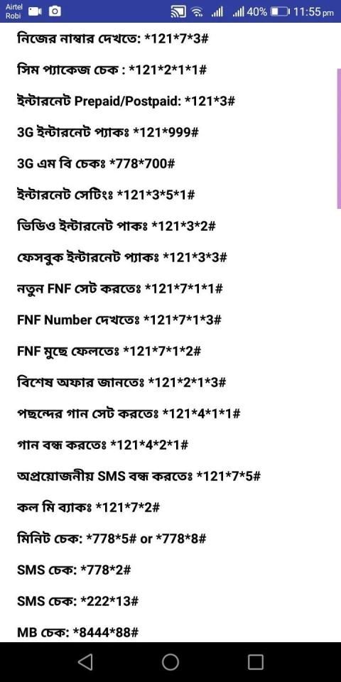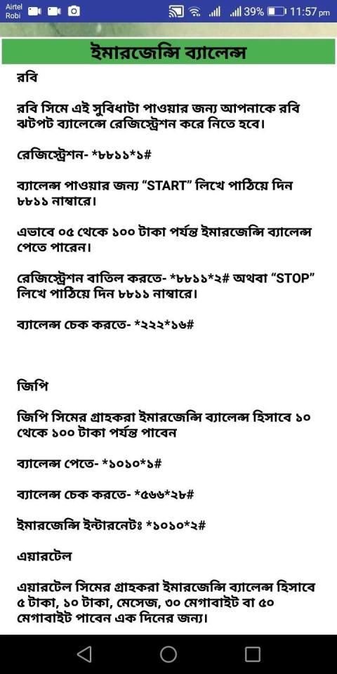 আমরা সকলে কোন কোন না সিমের গ্রাহক , এবং সকল সিমের অফার এবং ব্যবহার সম্পর্কে ও জানি না । যেমন আপনি যদি আপনার সিমের যে কোন অফার চেক করতে চান তখন আপনি নেটে এ সার্চ দিবেন কিন্তু এমবি কিনবেন কিভেবে, আপনার ফোনে নেট সেটিং আনবেন কিভাবে ,এসব কিছু আপনাকে জানতে হবে । আর এর জন্য চাই প্রয়োজনীয় কোড । এর সকল গাইড লাইন সহ নেট ব্যবহার সব কিছু আপনি পাবেন । যেমন নেট ব্যবহারে এমন কিছু অপশন থাকে আর টা হল নেট নেবার কোড যেমন এমবি চেক করতে *৫০০০*৫০০# এর দারা এমবি চেক করতে পারবেন। এমন আর ও অনেক ইনফরমেশন আপনি আমাদের এই এপস থেকে জানতে পারবেন, সিম রিলেটেড সব ধরেন কোড এবং তথ্য আপনি জানতে পারবেন।