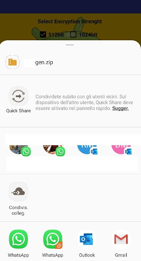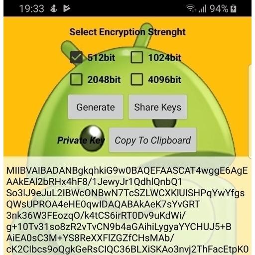 С несколькими простыми щелчками вы можете создать вашу ключевую пару выбора среди 512, 1024, 2048, 4096 бит шифрования.Сгенерированные ключи могут быть переданы (отправлены на внешние услуги), используя в WhatsApp, Gmail и других поддерживаемых приложениях.