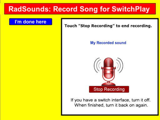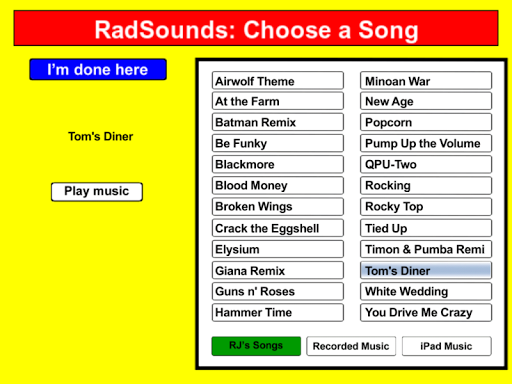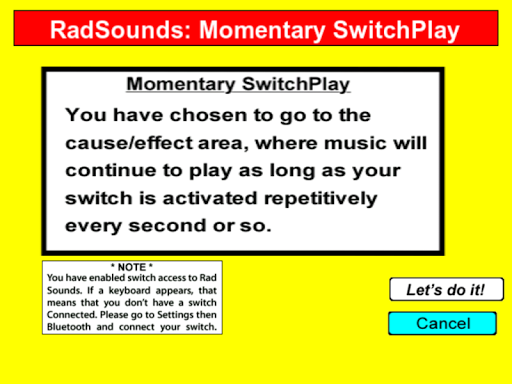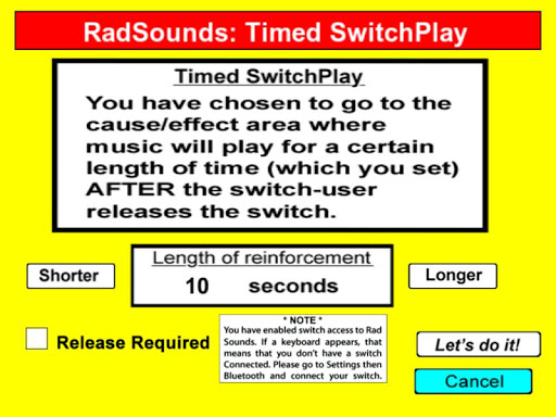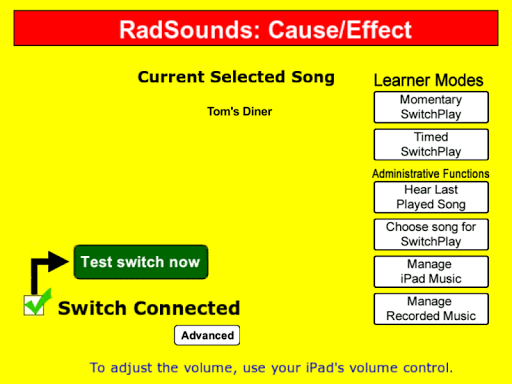 Radsounds - самая большая в мире музыкальная программа для причина / эффекта для специальных потребностей учащихся.Вы можете настроить свой плейлист, записывая или петь новую музыку на ваше устройство Android, импортируя из музыкальной библиотеки вашего устройства или использовать множество отличных песен, которые мы предоставляем, от многих типов.Существует мгновенный режим, где музыка играет только за время, когда вы держите палец на устройстве, Timed Mode, где музыка воспроизводится в течение определенного количества секунд после каждой активации, или расширенный режим, где пользователь выбирает песни, на велосипеде черезИх плейлист.