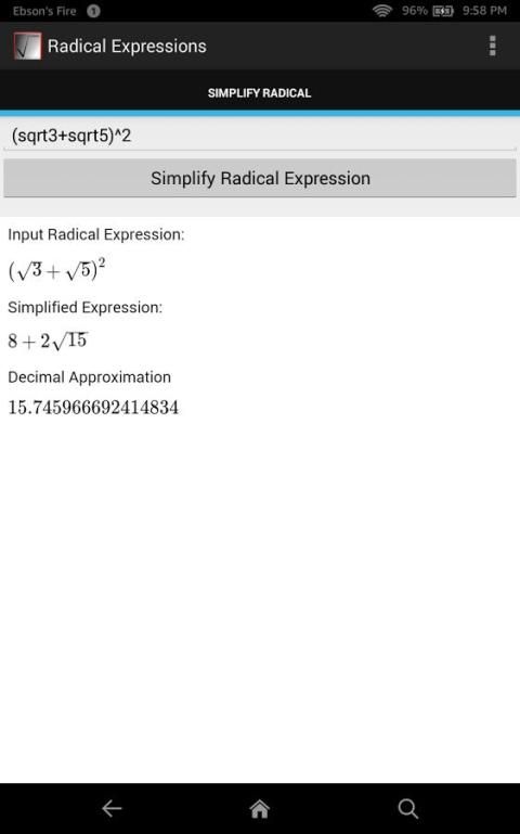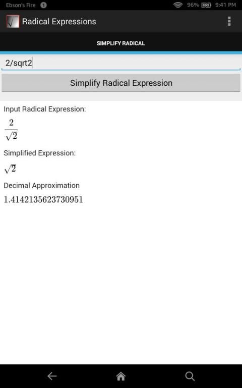 Radical Expressions App is neat, tidy and extremely useful a app. It is ideal for anyone who does mathematics. Anyone form high school students, to university students could use this tool for quick reference or for checking their work. It can be also used by teachers that need to check the work of their students or for their own purposes.
