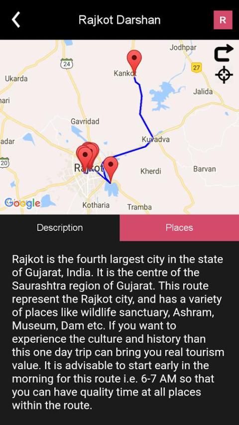 С помощью этого приложения, мы уверены, что вы сможете сделать свой путь к Раджкоту и его местным местам, как Jetpur, Virpur, Gondal, Dhoraji и другим красивым места и вокруг Раджкот района незабываемого опыта вашей жизни. Существует большая история, связанная с каждым местом Раджкота, и вы можете также получить знание Раджкота в каждом месте. Shree Джаларам БАПД родился в год 1800 г. н.э. в селе Virpur. Махатма Ганди High School (также известный как Альфред Ганди High School) в Раджкоте является одним из старейших институтов в Индии сегодня. Раджкот является четвертым по величине города в штате Гуджарат, Индия, после Ахмадабада, Сурат и Вадодара. Это центр Саураштры области Гуджарата. Таким образом, с путешествием вы можете увеличить свои знания о Раджкоте.