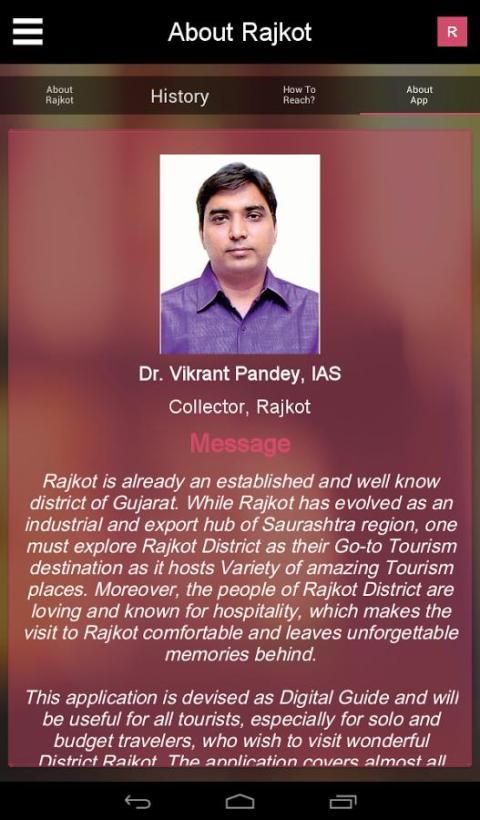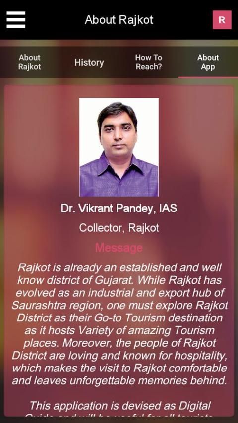 Collectorate Раджкота представляет Раджкот туризм App для посетителей и местных жителей Раджкота. Это приложение охватывает эксклюзивную богатую информацию о каждом месте Раджкота и его близлежащих мест. Это туризм дружественного приложение дает вам прекрасный живописный вид туристические мест с навигацией по карте, это приложение поможет вам сделать ваше путешествие комфортным и приятным.