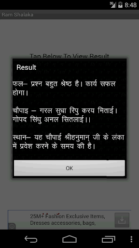 First remember Lord Shri Rama in your mind and pray him to give answer (don't disclose the Question to anyone before asking to Shri Rama). All you have to do is just click/Tap on any of the letters in the boxes with closed eyes with Thumb Only. For the best answer of your question you should have only close-ended question in your mind. Then a couplet (chaupai), the place from where it has been taken and Your Answer will be displayed on your screen.