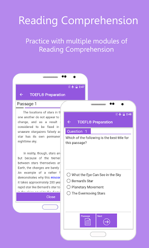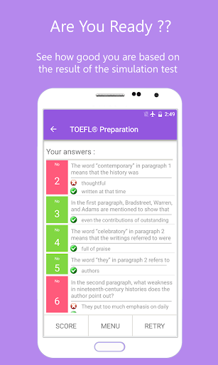 Это простое приложение может помочь вам получить лучшую оценку в тесте TOEFL®.Это приложение сосредоточено на части понимания чтения.Это помогает вам практиковать «понимание чтения» всякий раз, когда и где бы вы ни находились.Вы можете проверить свой навык «Часть A: словарный запас» или «Часть B: понимание чтения», а затем проверьте, правильный ли ваш ответ или неправильный.Если вы думаете, что вы готовы, вы можете проверить свой навык для чтения, перепрыгнув в тест моделирования.
