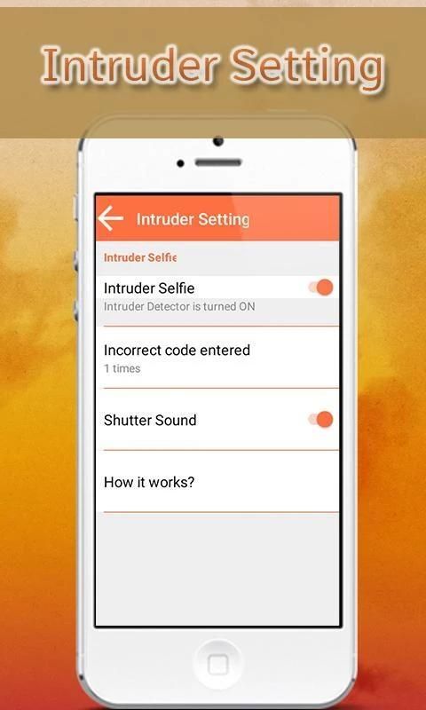 -> Intruder селфи поддерживается. Real App Блокировка принимает селфи лиц, вступающих неправильный PIN-код, шаблон для доступа к приложению.