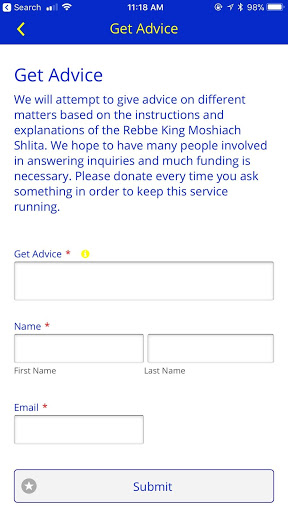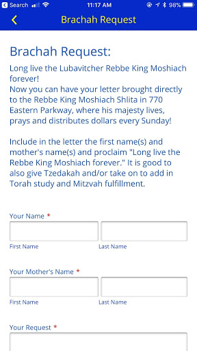 - Легко отправлять запросы Brachah и хорошие новости в Rebbe царь Moshiach Shlita в 770 году Beis Moshiach, где Rebbe царь Moshiach Шлита продолжает все его священные мероприятия, в том числе молящихся в хэшем для людей и дает всем Шличус Мицва к цедакам.