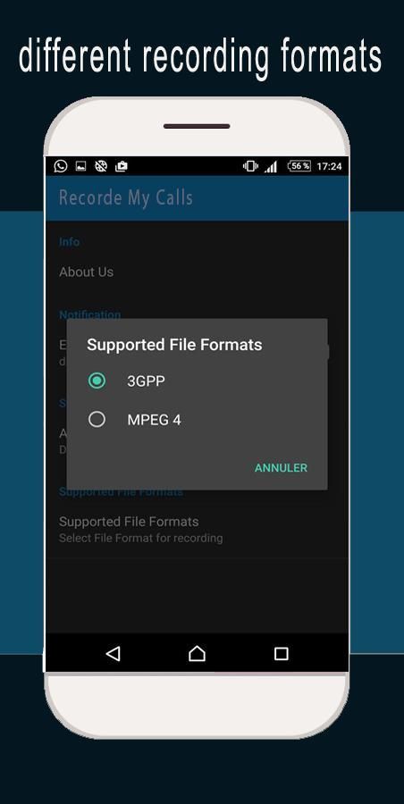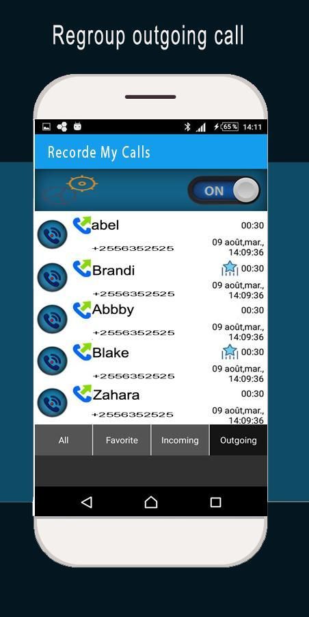 записывать мои звонки является удивительным бесплатно 2017 года приложение, которое имеет очень простую основную цель, чтобы записывать все ваши вызова (входящий и исходящий) 100% бесплатно. Это один из лучших регистраторов вызовов в Play Store. Обратите внимание на то, чтобы из-за ограничения STOCKAGE Android телефона, эта программа только может производить запись с микрофона. Пожалуйста, включите громкоговоритель во время разговора, чтобы получить чистый голос с другой стороны. его автоматический регистратор вызова вы можете выбрать, где запасти ваши файлы карты памяти или STOCKAGE телефона. мы можем сказать, что это лучший рекордер вызова приложений 2016 года